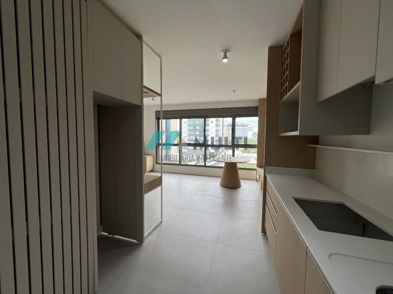 O apartamento com planta americana conta com living integrado, dois dormitórios sendo um suíte, banheiro social, uma vaga de garagem coberta e armário box.
