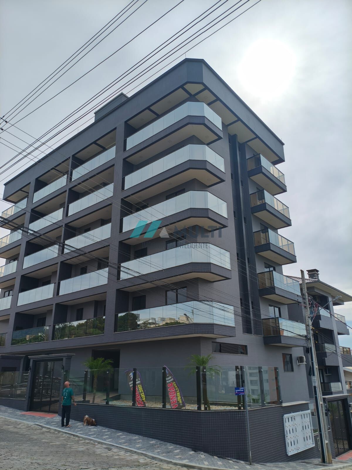 O edifício possui fachada totalmente pastilhada, trazendo sofisticação, durabilidade e baixa manutenção. Os parapeitos em vidro fumê agregam modernidade e elegância ao projeto.