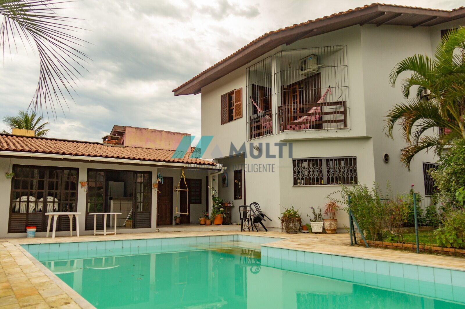 Uma casa com 4 dormitórios com sacadas para a piscina, sendo uma suíte master, Sala de estar e Sala de Jantar com rebaixe em gesso e iluminação, Sala de TV, Escritório, 4 banheiros , Cozinha mobiliada e área de serviço.
